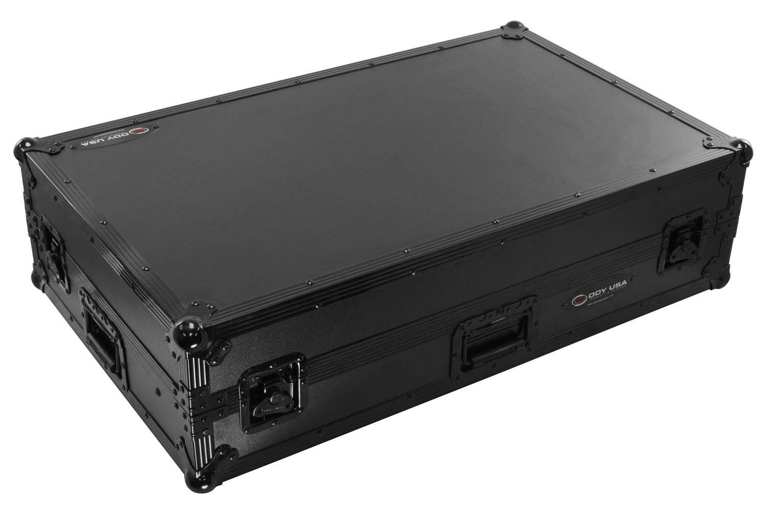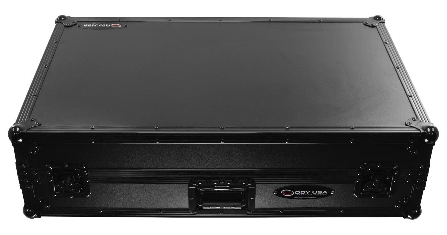 The Odyssey FZGSXDJXZWBL is a black label glide style flight case for Pioneer XDJ-XZ with wheels. Cable port hole. Glide platform port hole. Laptop platform glide style. Lid foam. Padlock loop. Roller wheels. Rubber feet. All black anodized and powder-coated hardware.